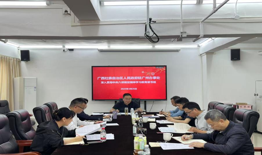 自开展深入贯彻中央八项规定精神学习教育以来,广西壮族自治区人民政府驻广州办事处(以下简称“广西办”)以习近平新时代中国特色社会主义思想为指导,认真按照上级党委工作部署,扎实有序开展学习教育,持续改进党员干部工作作风,为粤桂协作提供坚强作风保障。