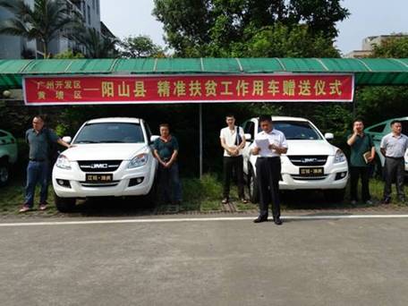 9月6日,广州开发区、黄埔区——阳山县精准扶贫工作用车赠送仪式在阳山县行政服务中心隆重举行,14辆新江铃域虎皮卡车正式赠送给阳山县相关村镇。黄埔区扶贫办常务副主任赵华堂、黄埔区驻阳山县工作组组长瞿桂宗、阳山县扶贫办副主任邹定君等出席仪式。