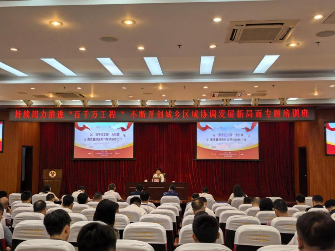 4月18日上午,市协作办党组书记、主任霍阳围绕《以“百千万工程”为引领,高质量推进对口帮扶协作工作》为题,在市委党校为参加“持续用力推进‘百千万工程’不断开创城乡区域协调发展新局面专题培训班(省对口班)”的学员进行结业授课。来自广州、梅州、湛江、肇庆和清远的60名“百千万工程”业务相关学员参加本次培训。