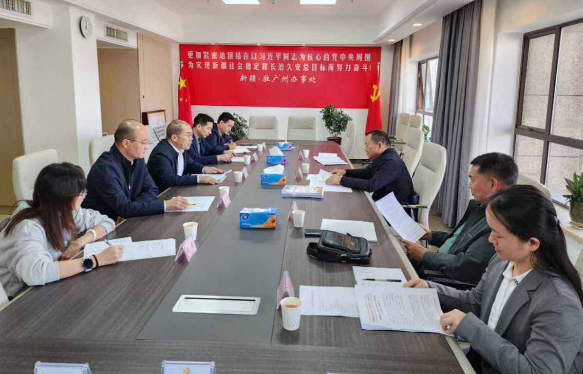 新疆驻穗办党支部书记、主任李缙介绍了办事处的基本情况,以及开展学习贯彻习近平新时代中国特色社会主义思想主题教育、党建工作、意识形态、精神文明、党风廉政、平安广州建设等工作情况以及下一步工作思路。随后,双方围绕高标准落实党建引领、强化服务保障、推进社会稳定和长治久安基本目标,就巩固主题教育成果,深入抓好党组织建设、意识形态、精神文明、党风廉政、平安广州建设等常态化工作进行了深入座谈交流。