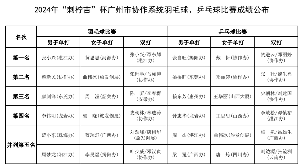 为深入贯彻落实习近平总书记关于实施全民健身国家战略,全面推进群众体育健康发展的重要讲话、重要指示批示精神,广州市协作办公室工会和全国驻穗机构联谊会紧紧围绕凝心聚力跟党走、团结奋进促交流、强身健体助兴业的目标,于5月10日至11日,在广州市工人体育馆联合举办了2024年“刺柠吉”杯广州市协作系统羽毛球、乒乓球比赛活动,共有30支队伍339名运动员报名参加了比赛。广州市协作办公室党组书记、主任霍阳同志,党组成员、副主任邹勇刚同志,以及部分驻穗机构领导出席了比赛活动。广州市协作办公室工会主席、市管一级调研员朱兴良同志全程组织了比赛活动。